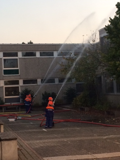 Beim Eintreffen der Jugendfeuerwehrmitglieder stand bereits ein Gebäudeflügel des Schulzentrums in Vollbrand. Mit 6 C-Rohren hieß es das Feuer zu löschen und den restlichen Teil der Schule zu schützen. Da so langsam die Dunkelheit anbrach, wurde die komplette Einsatzstelle mit mehreren Strahlern ausgeleuchtet.. Das Feuer wurde schnell unter Kontrolle gebracht. Nach gut einer Stunde konnte "Feuer aus" gemeldet werden.