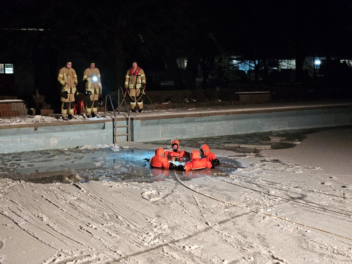 Am letzten Dienstabend des Löschzugs Lügde stand das Thema Eisrettung im Mittelpunkt. Hierzu nutzten wir das Freibad Lügde, das derzeit ideale Bedingungen bietet, um verschiedene Szenarien realitätsnah zu üben und unterschiedliche Rettungsmittel auszuprobieren. Bei Minusgraden um -3 °C und einer Eisdicke von bis zu mehreren cm ergaben sich verschiedene Einsatzszenarien von geschlossener tragfähiger Eisdecke, bis hin zu eingebrochenen Personen.