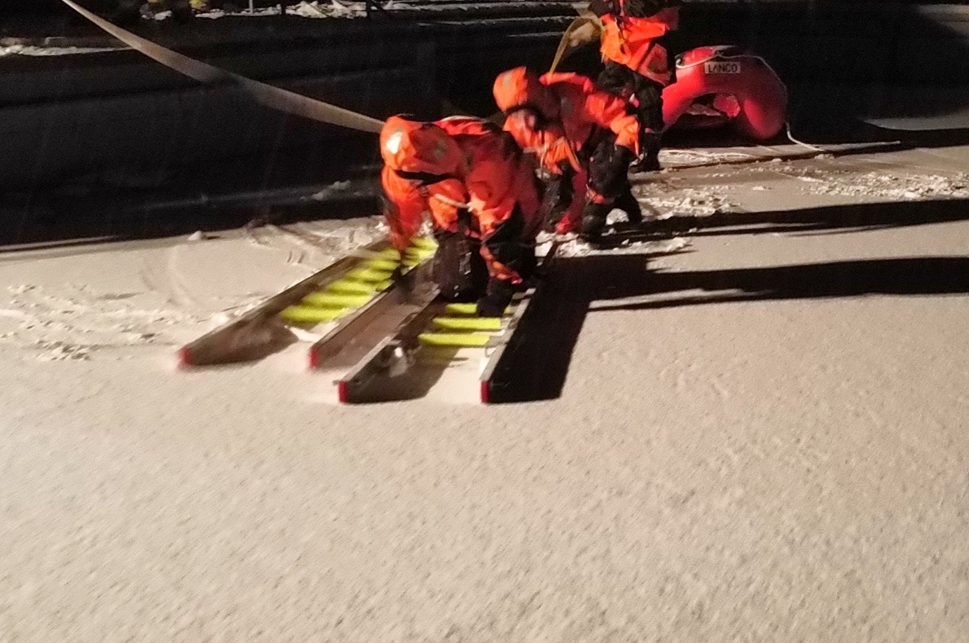 Während des Übungsabends wurden mehrere Vorgehensweisen zur Rettung im Eisunfall getestet. Dazu gehörten unter anderem der Einsatz von Eisrettungsboot, Steckleiterteilen oder reiner Leinensicherung sowie weiterer spezieller Ausrüstung. Die Kameradinnen und Kameraden hatten die Möglichkeit, die Handhabung der Geräte intensiv zu trainieren und die verschiedenen Rettungstechniken praktisch zu erproben. Besondere Aufmerksamkeit galt dabei der sicheren Annäherung an eingebrochene Personen, der Eigenschutz der Einsatzkräfte und dem schnellen, koordinierten Vorgehen im Team.