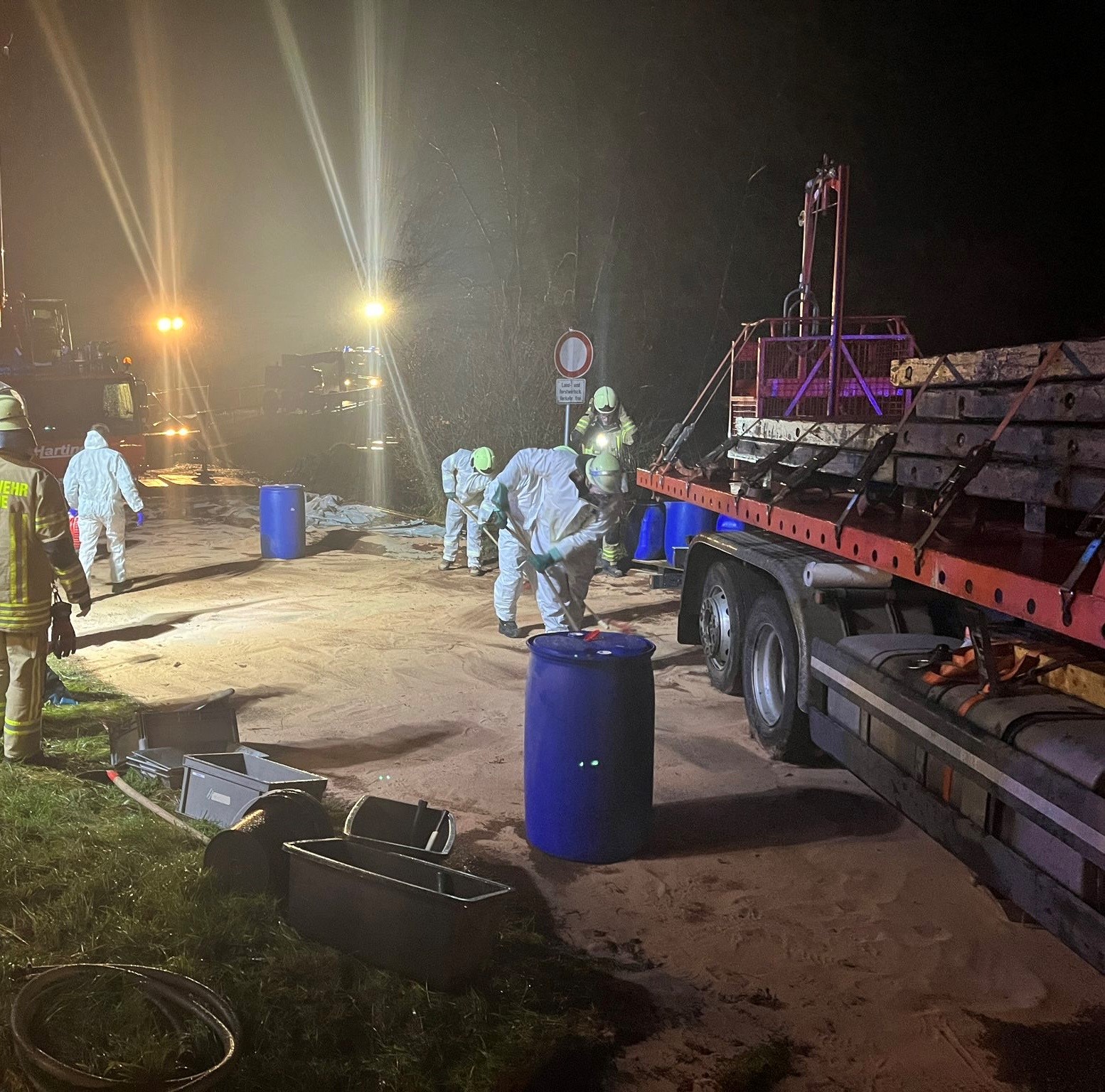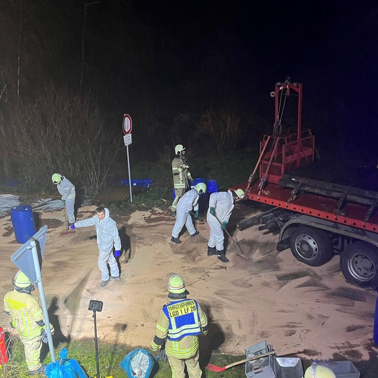 Die Freiwillige Feuerwehr Lügde wurde heute mit dem Stichwort „Technische Hilfe" zu der Baustelle an der Ullensen Brücke / Harzberger Straße alarmiert. Aus dem aufgerissenen Tank eines dort tätigen Lastwagen, trat Dieselkraftstoff aus. Der Fahrzeugtank konnte durch die Feuerwehr Lügde provisorisch abgedichtet werden. Nachdem der Tank abgedichtet war, wurde der noch im Tank befindliche Kraftstoff durch die Einsatzkräfte mit Unterstützung eines Lügder Tankstellenunternehmens abgesaugt. Ein zur weiteren Unterstützung angefordertes Spezialfahrzeug der Feuerwehrtechnischen Zentrale Emmerthal konnte die Einsatzfahrt vorzeitig abbrechen. Aufgrund des Austritts des Kraftstoffes wurde der Bereich rund um die Gefahrenstelle großflächig mit Bindemittel abgestreut. Insgesamt wurden ca. 80 Sack Bindemittel an der Einsatzstelle verarbeitet. Anschließend wurde das Bindemittel aufgenommen und der Fachgerechten Entsorgung zugeführt. Zusätzlich wurde das Umweltamt des Kreis Lippe zur Einsatzstelle gerufen, dieses veranlasst die erforderlichen Erdarbeiten durch eine Spezialfirma. Während des gesamten Einsatzes wurde der Brandschutz mit zwei unabhängigen Löschmitteln sicher gestellt. Nachdem die Einsatzstelle an das Umweltamt übergeben wurde, konnte die aufwendige Reinigung der Gerätschaften und Einsatzkleidung erfolgen. Nach rund 3 Stunden war der Einsatz für die Feuerwehr Lügde beendet.