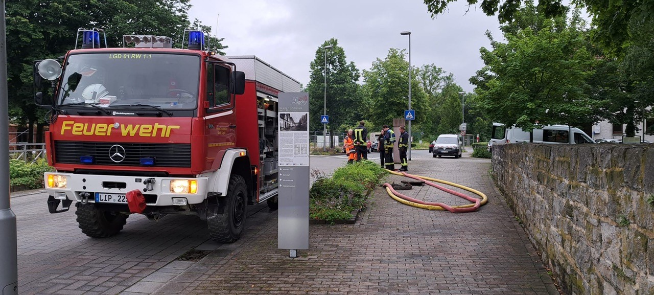 Die Einheit Lügde wurde mit dem Einsatzstichwort "Wasserschaden/ Wasser im Keller" in die Höxterstraße alarmiert. Nach einem kurzen ergiebigen Regenschauer war die Kanalisation in der Höxterstraße vollgelaufen. In einem tiefen gelegten Gebäude drückte dadurch das Wasser in den Keller. Die Einsatzkräfte haben den Keller Spannungsfrei gemessen und pumpten im Anschluss den Keller leer. Da das Öffentliche Netz durch die Regenmassen überlastet war, wurden 2 weitere Tauchpumpen eingesetzt, um Entlastung zu schaffen und weiteres Eindringen in Häuser zu verhindern. Nach gut eineinhalb Stunden war der Einsatz für die Feuerwehr beendet.