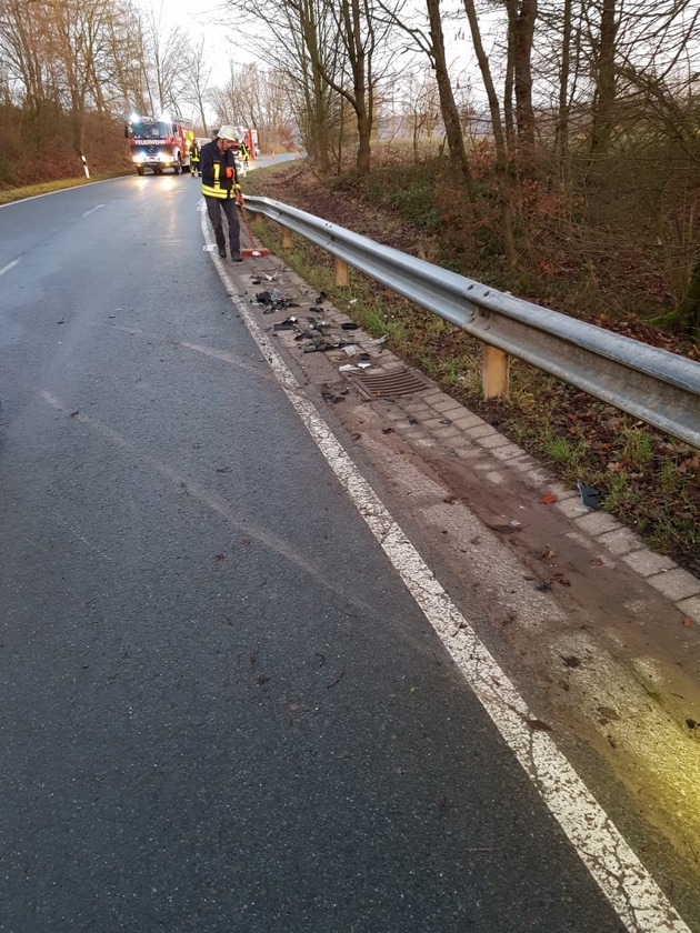 Zeitgleich zu dem Verkehrsunfall im Schwalenberger Wald wurde der Löschzug Wörmketal sowie die Löscheinheit Falkenhagen zu einem Ölschaden nach Verkehrsunfall zwischen Wörderfeld und Falkenhagen alarmiert. Hier kam ebenfalls ein PKW von der Fahrbahn ab und prallte gegen die Leitplanke und verlor auf ca. 200 Meter Betriebsstoffe. Bei diesem Unfall wurde niemand verletzt. Die Einsatzkräfte sicherten die Einsatzstelle gegen den fließenden Verkehr ab und streuten die Betriebsstoffe mit speziellem Bindemittel ab. Im Anschluss wurde das Bindemittel wieder aufgenommen und fachgerecht entsorgt. Weitere Maßnahmen waren an der Einsatzstelle nicht nötig.