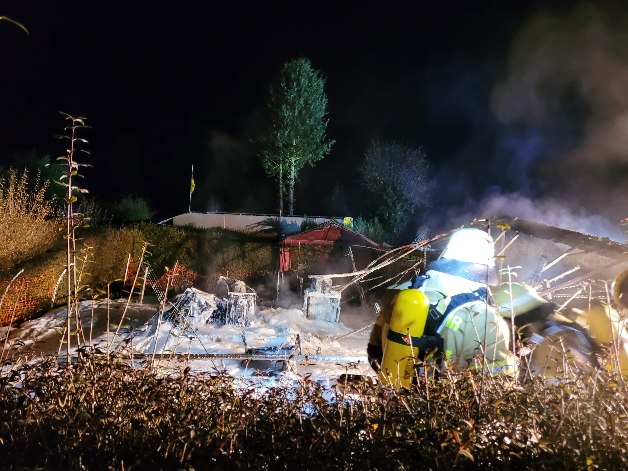 Die Einheiten Elbrinxen und Sabbenhausen wurden zu einem Feuer auf dem Campingplatz in Elbrinxen alarmiert. Vor Ort brannte ein Wohnwagen mit Anbau in voller Ausdehnung.Sofort wurde durch die Feuerwehr ein Löschangriff unter Atemschutz vorgenommen und die Einsatzstelle ausgeleuchtet.Aufgrund der eingeschränkten Löschwasserversorgung alarmierte der Einsatzleiter das Grosstanklöschfahrzeug der Einheit Lügde zur Unterstützung nach.Im weiteren Einsatzverlauf wurde die Brandstelle durch einen Schaumteppich abgedeckt um vorhandene Glutnester zu ersticken.