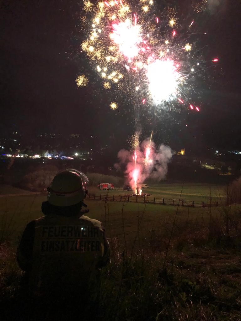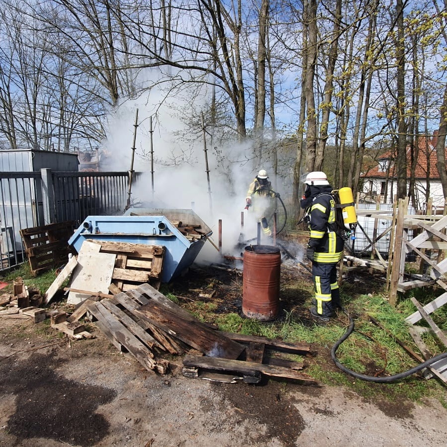 An der Einsatzstelle stellte sich heraus, dass auf einer Fläche von ca. 4 m x 10 m Büsche, 2 Holzstapel und ein Container brannten. 2 Trupps unter Atemschutz löschten die Fläche großzügig mit Wasser ab. Um an die Glutnester unter den Holzstapeln zu gelangen, wurden diese auseinandergezogen und auch mit Wasser abgelöscht. Da ein späteres wiederaufflammen verhindert werden sollte, wurde mit der Schaumpistole ein Netzmittel aufgebracht.