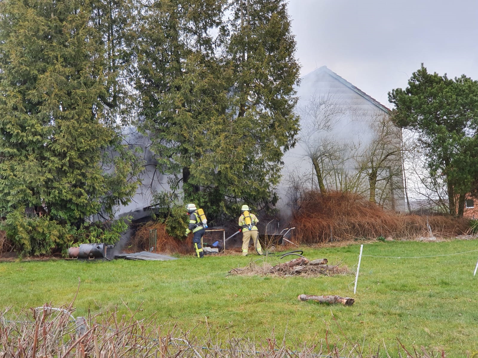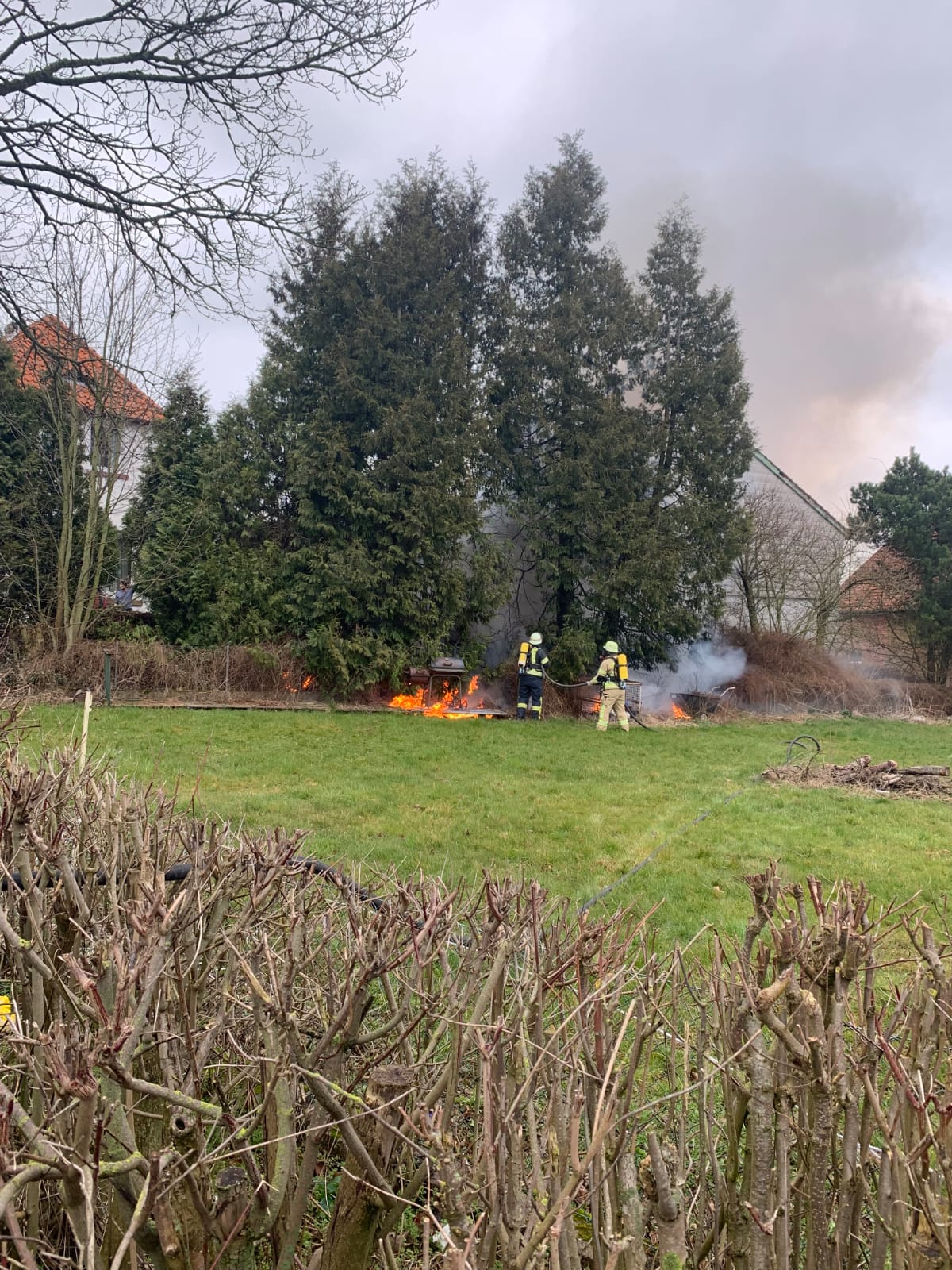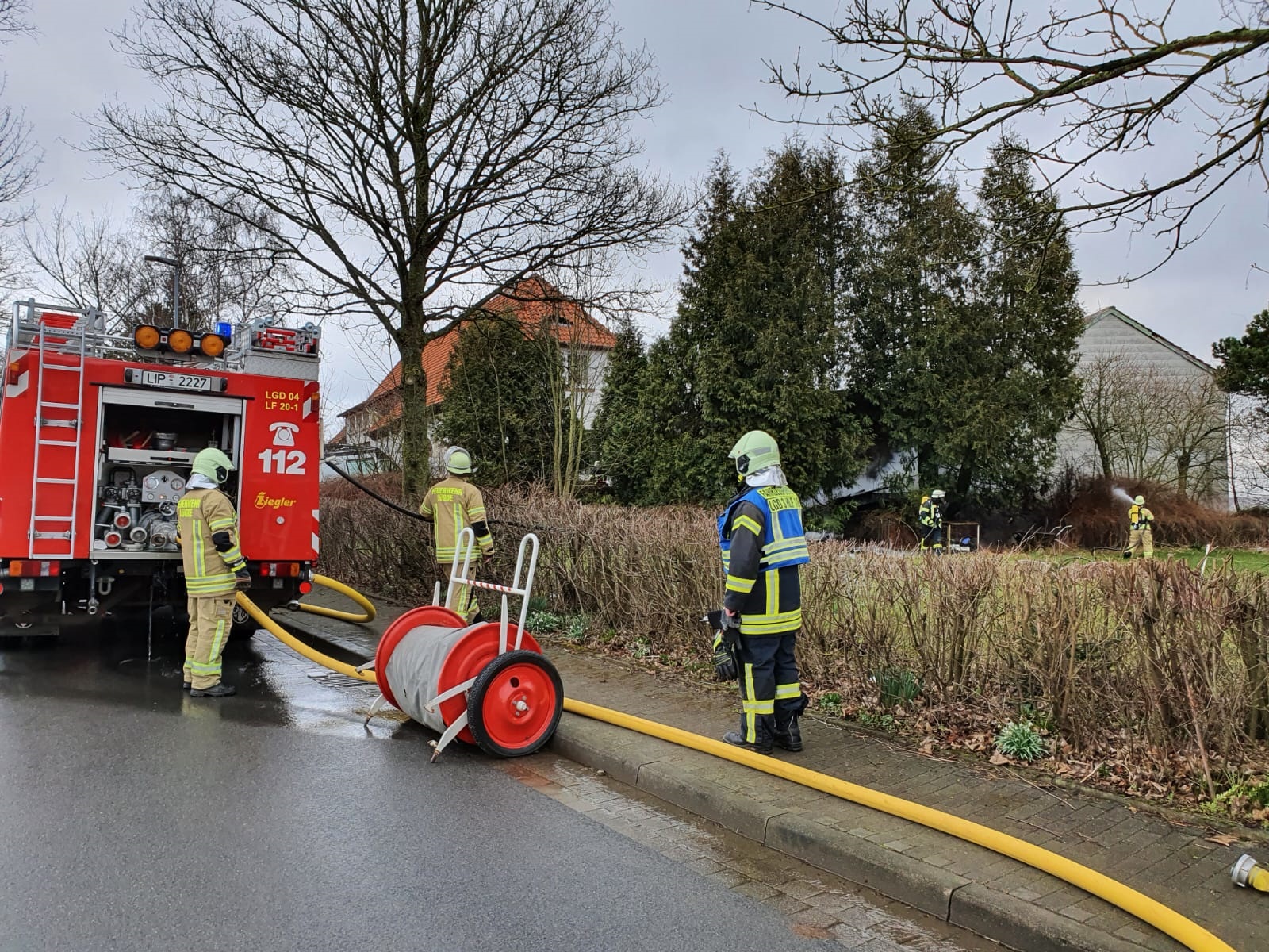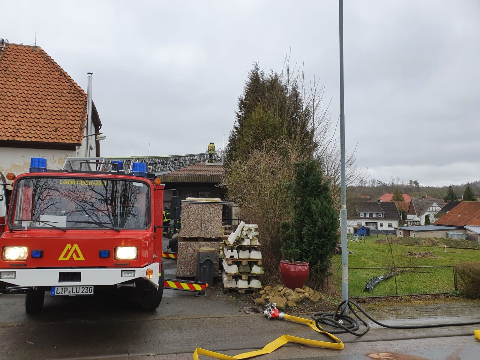 Aus bislang ungeklärter Ursache geriet eine Böschung und 4 Tannen in der Vahlbrucher Straße in Brand. Die Leitstelle der Feuerwehr alarmierte daraufhin die Einheiten Wörderfeld, Sabbenhausen, Elbrinxen, Falkenhagen und Lügde mit dem Einsatzstichwort Feuer 2. Mittels Vornahme von 2 C-Rohren und 2 Trupps unter PA konnte eine Brandausbreitung sowie das Übergreifen auf das unmittelbar angrenzende Carport verhindert werden. Im Zuge der Nachlöscharbeiten wurden die angrenzenden Gebäudeteile mittels Drehleiter und Wärmebildkamera kontrolliert. Im weiteren Verlauf des Einsatzes musste ein in Brand geratener und bereits abgebrochener Ast aus ca. 2 Höhe durch die Einsatzkräfte entfernt und abgelöscht werden. Die gesamte Umgebung der Brandstelle wurde abschließend ausgiebig unter Zuhilfenahme eines Netzmittels benetzt um ein erneutes aufflammen zu verhindern.