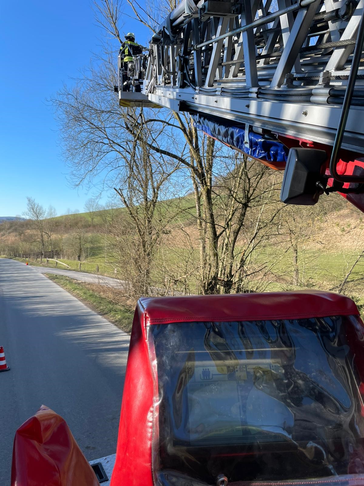 Die Einheit Lügde wurde durch die Kreisleitstelle mit dem Einsatzstichwort "Technische Hilfe: Ast droht aus Krone zu fallen" alarmiert. An der Einsatzstelle stellte sich heraus, dass ein großer Ast aus einer Baumkrone herausgebrochen war und drohte herabzustürzen. Die Einsatzkräfte beseitigten die Gefahrenlage.