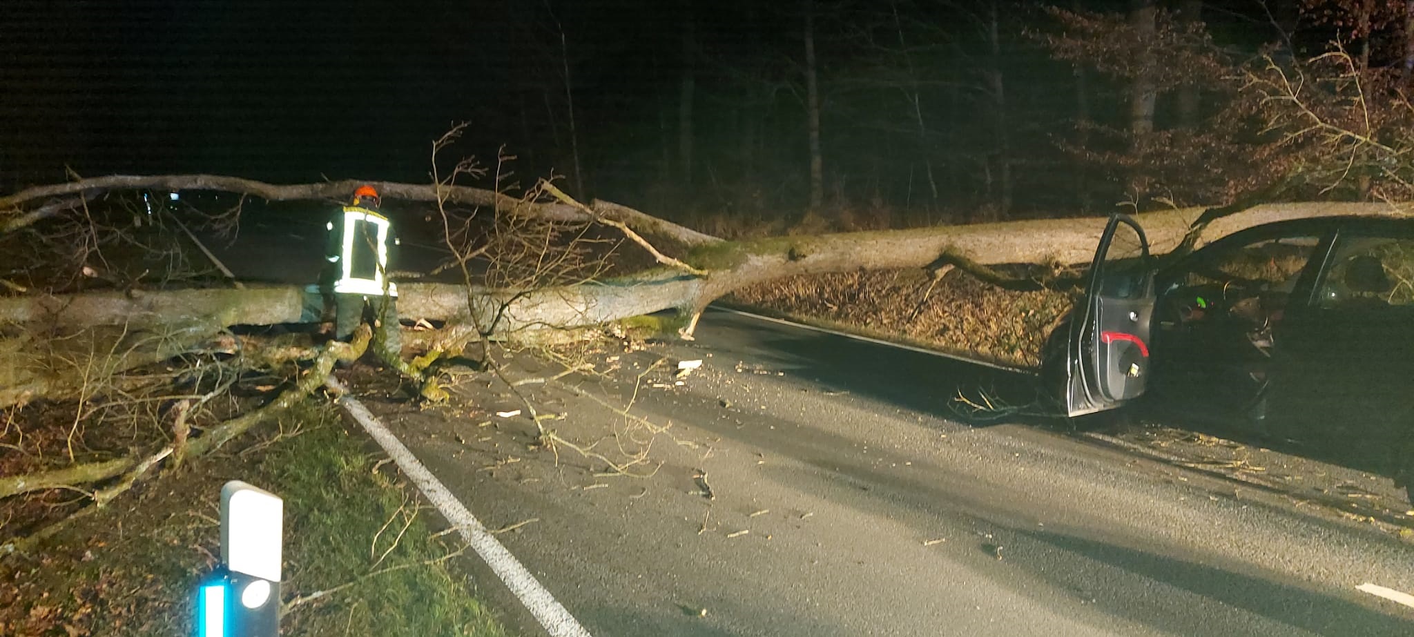 Ein Baum war umgekippt und blockierte die Landstrasse. Ein PKW konnte nicht rechtzeitig bremsen und geriet unter den quer über die Fahrbahn liegenden Baum.