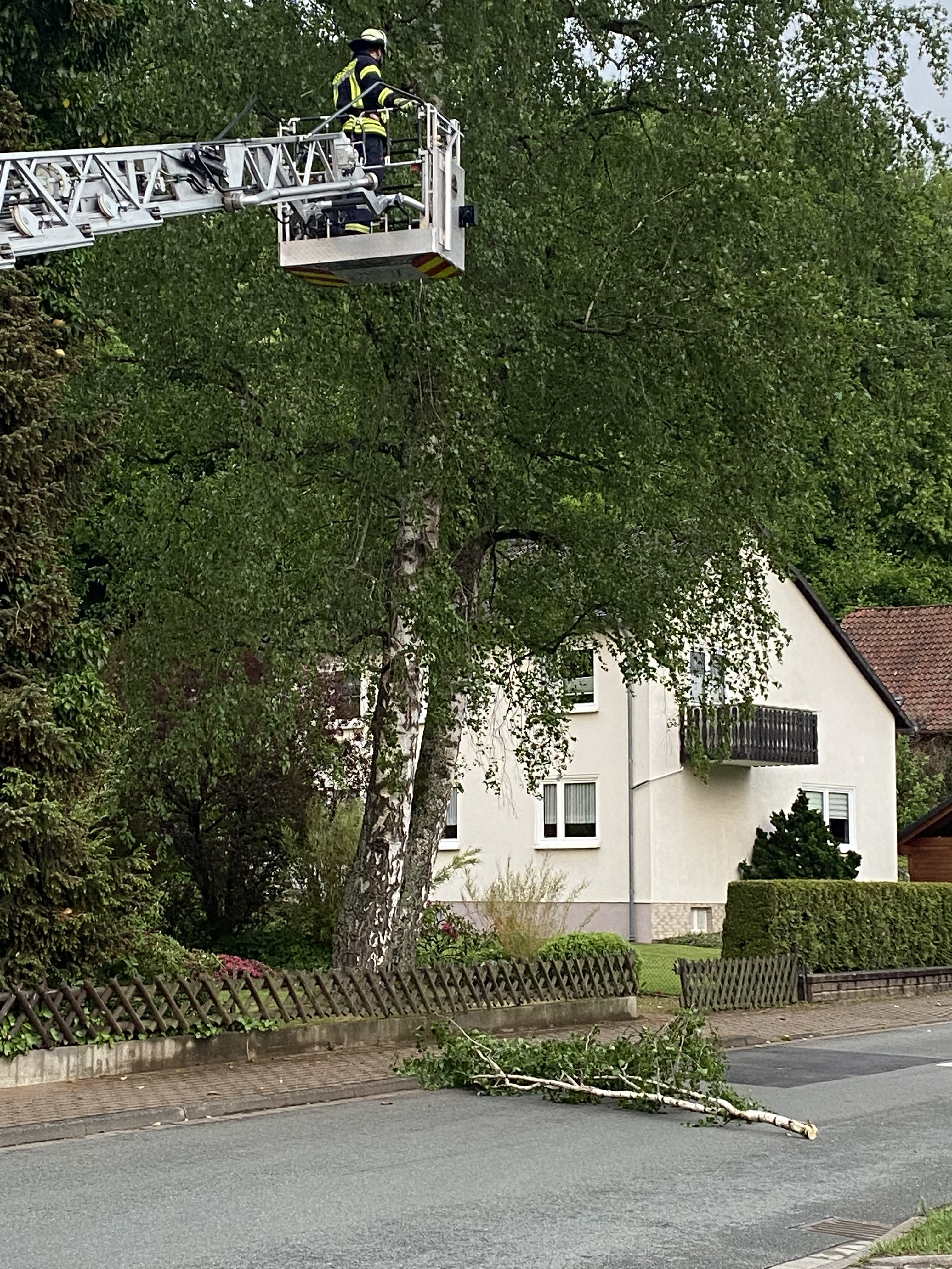 Der Einheit Lügde wurde eine Gefahrenlage durch einen abgebrochenen Ast in der Straße "Unter den Klippen" gemeldet. An der Einsatzstelle stellte sich heraus, dass ein Ast aus einer Birke herausgebrochen war und über einem Fußgängerweg sowie einen Teil der Fahrbahn hing. Nach dem die Einsatzstelle abgesichert war, beseitigten die Einsatzkräfte die Gefahrenstelle.
